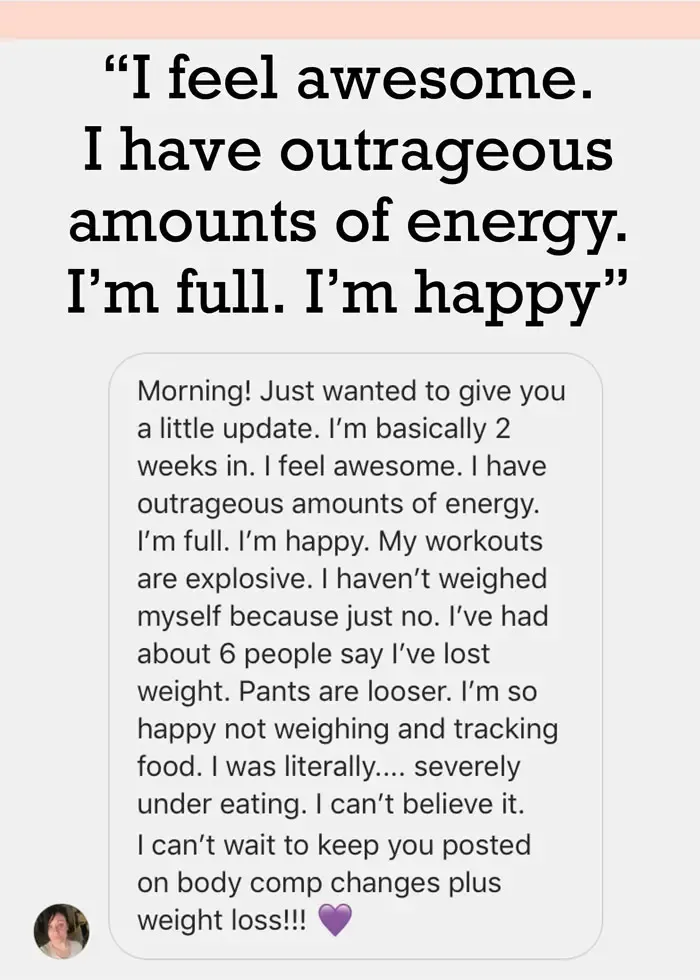 I was eating MORE food, MORE carbs AND I reduced my cardio drastically - it didn’t make any sense? I’ve held the ‘eat less, increase cardio’ mindset for most of my adult life. I know the frustration. But I’m here to tell you - it doesn’t work. Putting your HEALTH first is what works long-term.